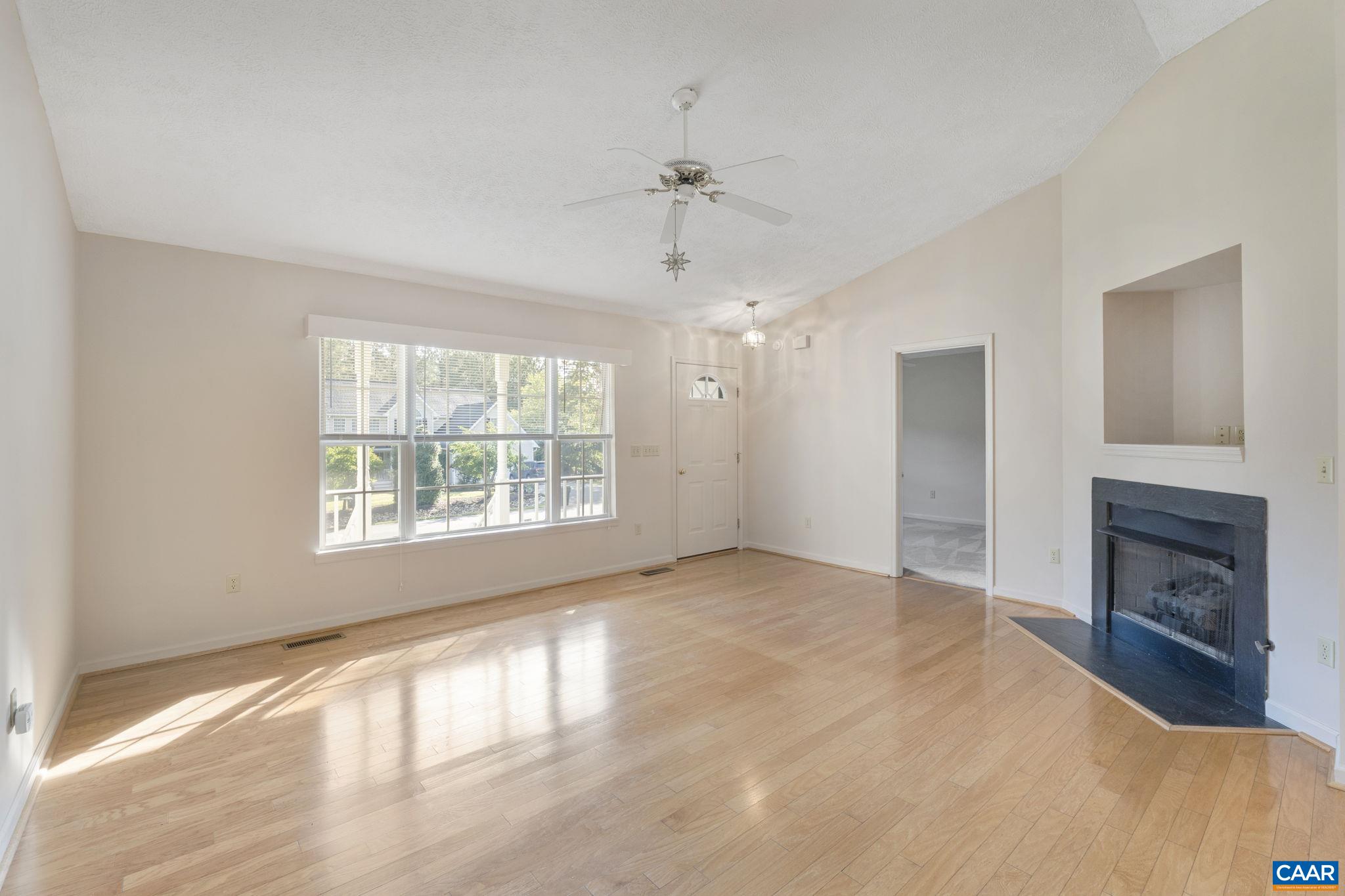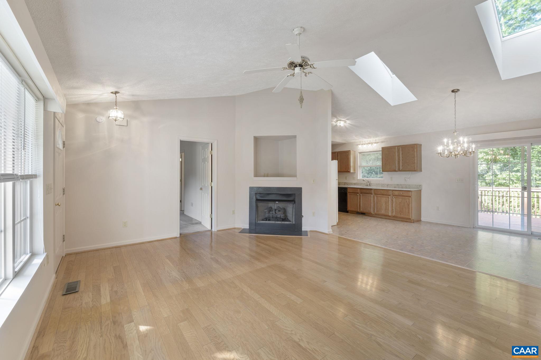 Charming One-Level Home! Discover the perfect blend of comfort and style in this 3-br, 2-ba home, ideally situated on a spacious, private corner lot in the sought-after Lake Monticello community. Built in 1996 & freshly painted inside, this home features gleaming hardwood floors in the main living areas, cozy carpeted bedrooms, & abundant natural light from skylights and vaulted ceilings. The inviting living room boasts a corner gas log fireplace, while the kitchen offers granite countertops, maple cabinets, & plenty of prep space. Enjoy ceiling fans in every bedroom, a walk-in closet in the primary suite, & a luxurious primary bath for relaxation. Outdoor living is a breeze with a back deck & a side brick paver patio—perfect for entertaining. Additional highlights include a 2-car garage with a pedestrian door, an outside storage shed, & easy access to all of Lake Monticello’s amenities. This move-in-ready gem offers convenience, privacy, and charm all in one!