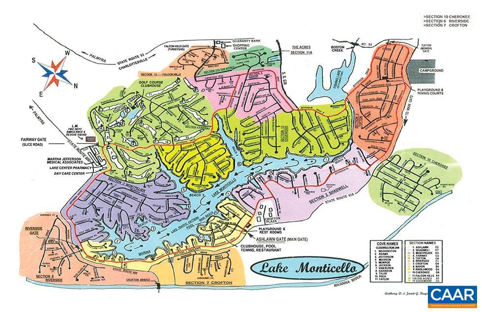 Directions: LAKE monticello main gate right Jefferson dr to left on tanglewood walk to clubhouse and main beach