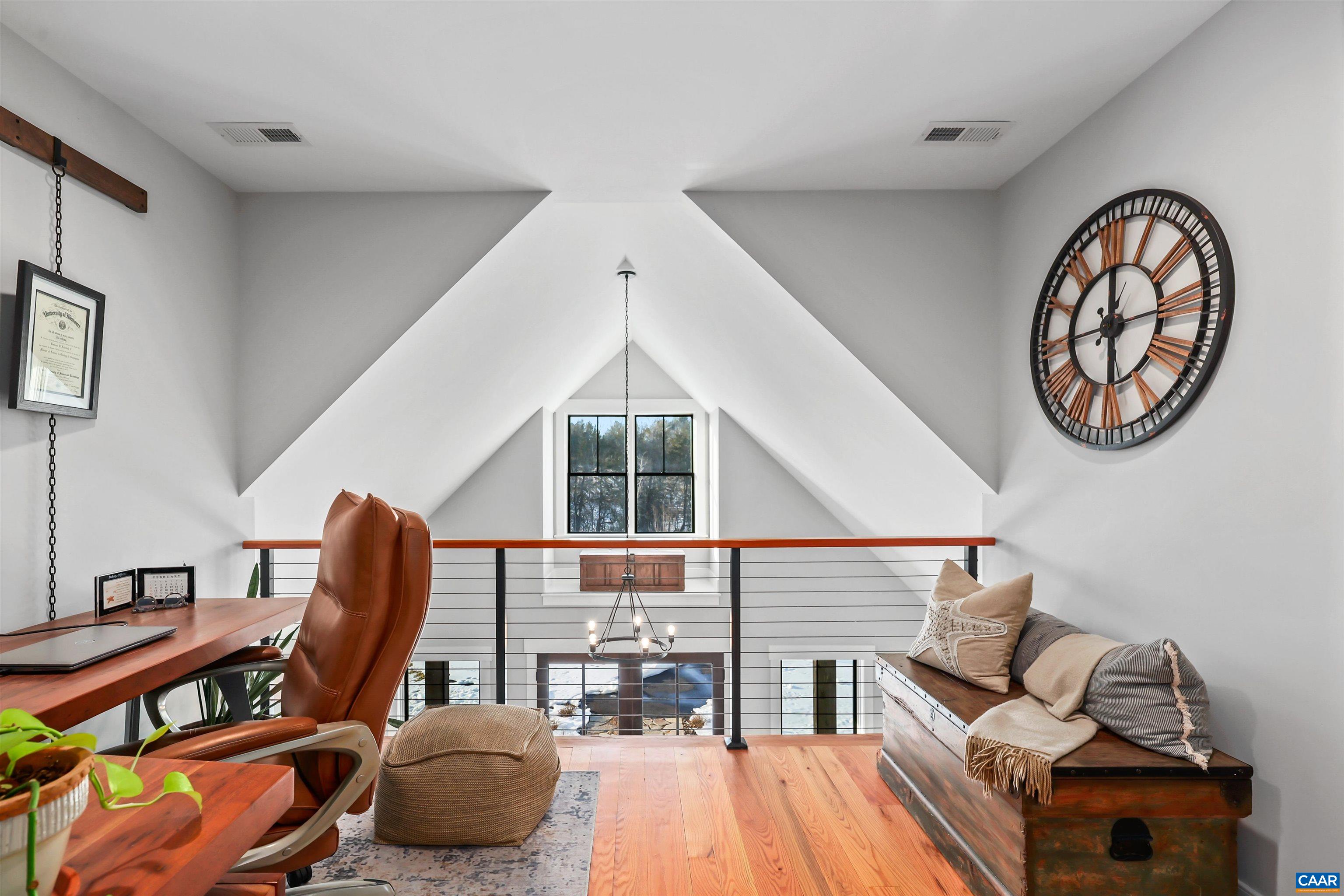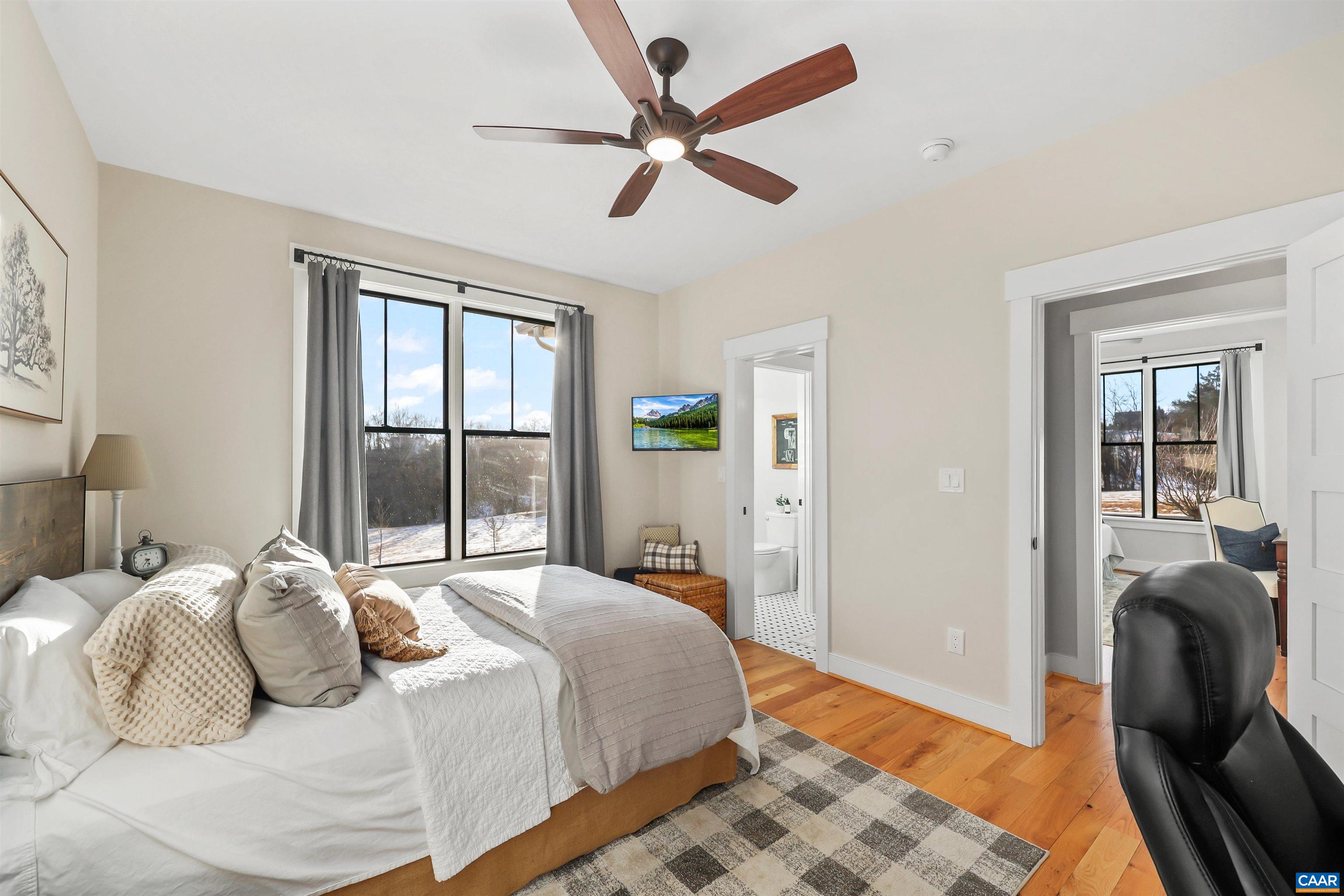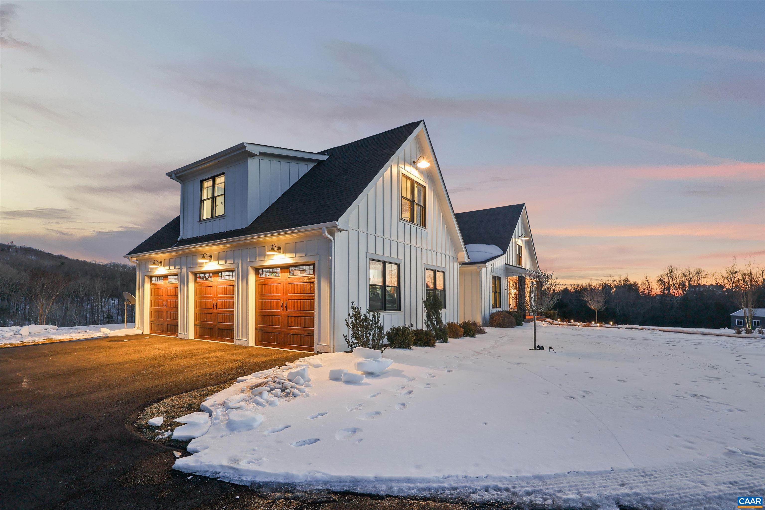 Welcome to this exceptional 5BR, 3.5BA custom-built home offering modern living in a peaceful setting. Hardwood floors, custom cabinetry, and two gas fireplaces highlight the interior, along with dual fuel HVAC, solar panels with battery and whole-home generator backup, tankless water heater, Level 2 EV outlet, and security with exterior monitoring. The kitchen features a 9’ island, granite and Carrera marble countertops, open shelving, a walk-in pantry, and KitchenAid commercial-style appliances including a 6-burner gas cooktop, wall oven, microwave/oven combo, French-door refrigerator, dishwasher, and wine fridge. The loft-style primary suite offers a private balcony, oversized custom walk-in closet, loft office space, and spa-like bath with soaking tub, dual sinks, and large shower. Guest bedrooms share a connecting bath with dual sinks and walk-in shower. A rec room opens to the back porch, and a finished suite above the 3-car garage offers 2 additional bedrooms. Outdoors enjoy TimberTech decking, stone firepit, fenced pasture, custom barn, paved drive, year-round stream, and private trails, all under 15 minutes to Rivanna Station and Hollymead Town Center. Offering a VA assumable loan at 2.75% (~$927K) for qualified buyers.