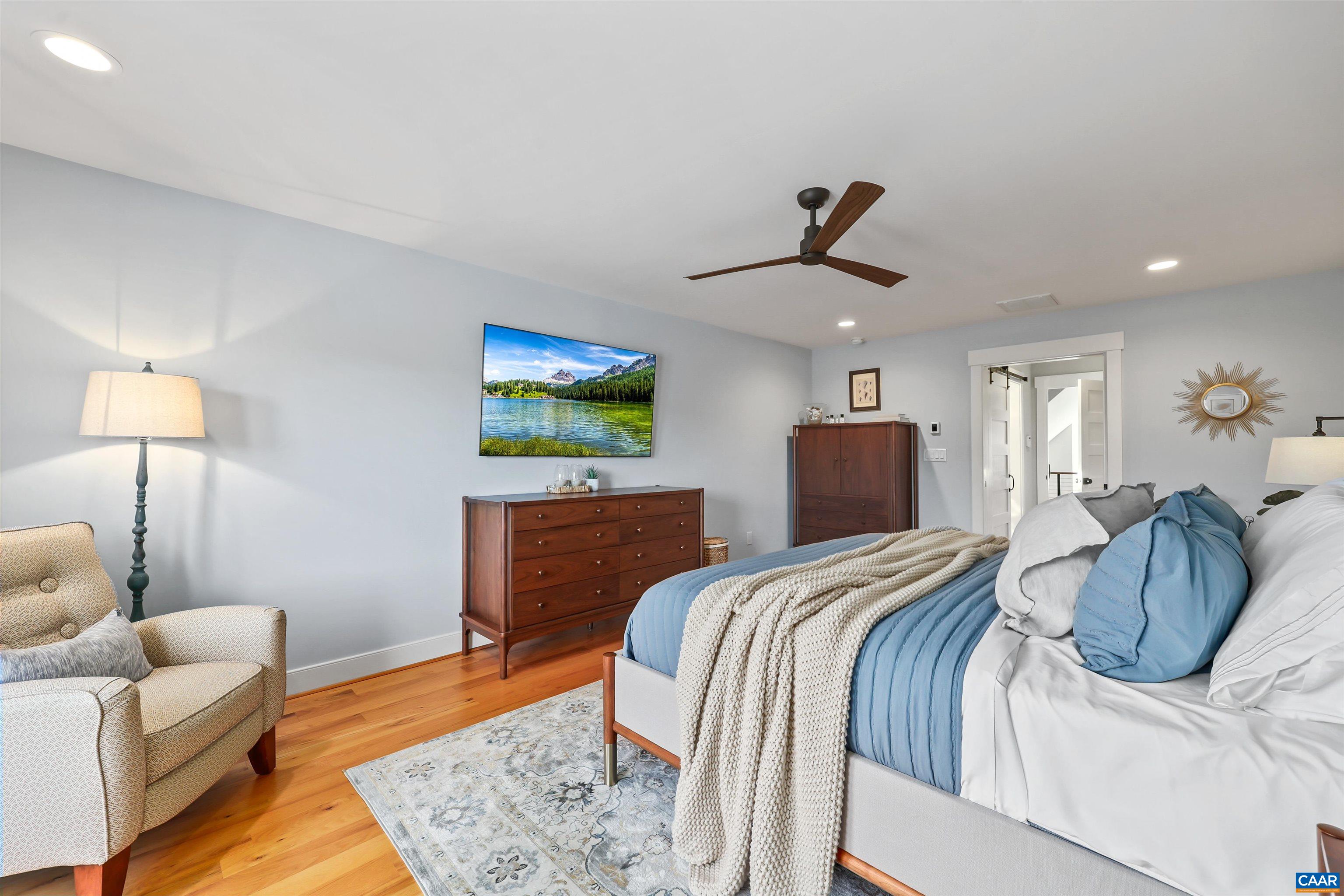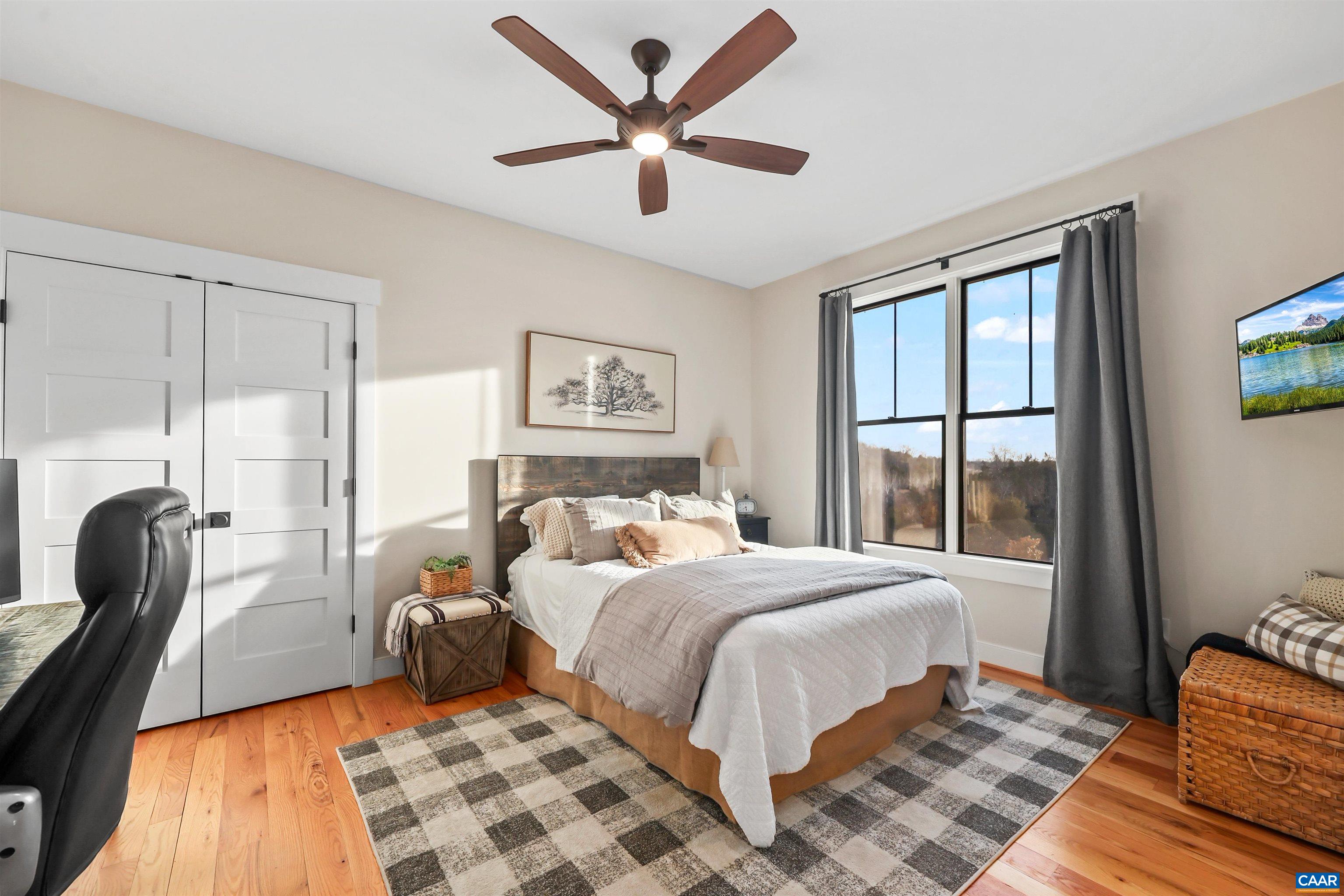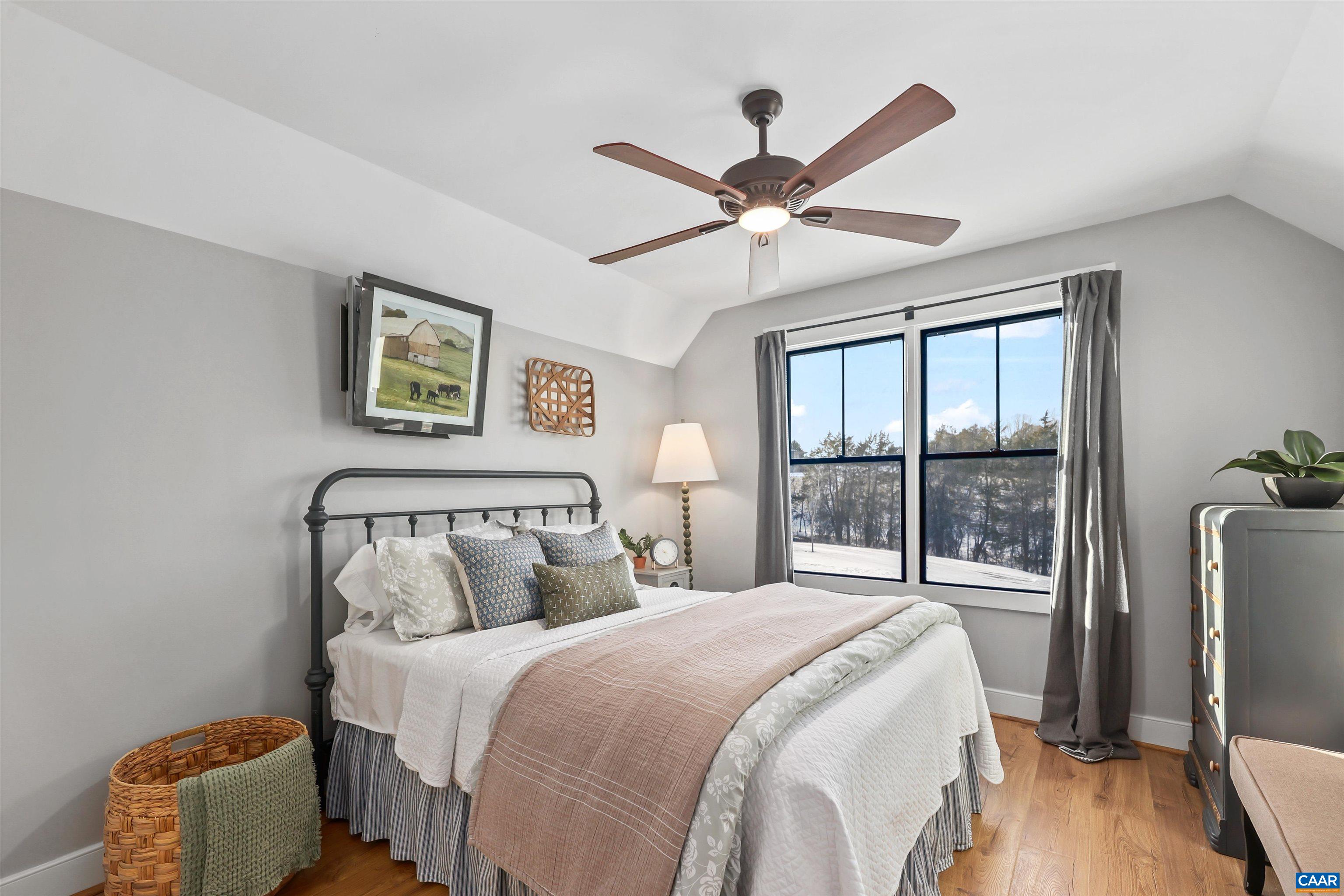 Welcome to this exceptional 5BR, 3.5BA custom-built home offering modern living in a peaceful setting. Hardwood floors, custom cabinetry, and two gas fireplaces highlight the interior, along with dual fuel HVAC, solar panels with battery and whole-home generator backup, tankless water heater, Level 2 EV outlet, and security with exterior monitoring. The kitchen features a 9’ island, granite and Carrera marble countertops, open shelving, a walk-in pantry, and KitchenAid commercial-style appliances including a 6-burner gas cooktop, wall oven, microwave/oven combo, French-door refrigerator, dishwasher, and wine fridge. The loft-style primary suite offers a private balcony, oversized custom walk-in closet, loft office space, and spa-like bath with soaking tub, dual sinks, and large shower. Guest bedrooms share a connecting bath with dual sinks and walk-in shower. A rec room opens to the back porch, and a finished suite above the 3-car garage offers 2 additional bedrooms. Outdoors enjoy TimberTech decking, stone firepit, fenced pasture, custom barn, paved drive, year-round stream, and private trails, all under 15 minutes to Rivanna Station and Hollymead Town Center. Offering a VA assumable loan at 2.75% (~$927K) for qualified buyers.