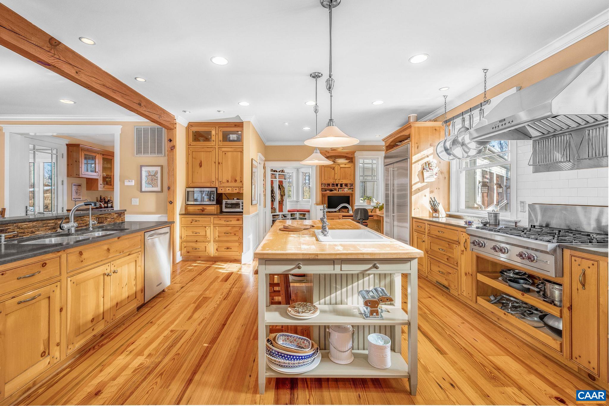Nestled privately overlooking Blue Ridge views, this totally custom 5 bedroom 4.5 bath Arts & Crafts farmhouse is truly a remarkable offering built by the current owners who spared no expense creating this unique residence. From the beautiful heart pine floors to the incredible dry laid stonework at the massive family room fireplace to the wonderful bluestone terrace & Buckingham slate covered patio & screened-in porch overlooking the views, there are wonderful, timeless finish details at every turn. The 3 car garage is accessed via covered breezeway. A small creek runs along the back of the property. Other noteworthy features incl' an expansive 1st floor primary, whole house generator, fiber internet, and 4 HVAC zones w/ hydrothermal heating w/ ultra-high efficiency gas fired boiler. The large mudroom has sink & built-in cubbies. Flooring incl' heart pine, Buckingham slate & marble. Other notable extras include a wet bar, extensive wainscotting & built-ins incl' window seats. The kitchen showcases completely custom, solid wood cabinetry, honed granite counters, 48" fridge, Wolf gas cooktop w/ commercial hood, warming drawer, double ovens & wooden center island. Please see the detailed list of features in the documents tab.
