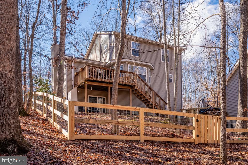 Welcome to this beautifully updated three-story home in Lake Monticello, offering exclusive water access and a prime location near the Riverside gate. This well-maintained residence features 3 bedrooms, 3.5 baths, and approximately 2,500 finished square feet of flexible living space designed for everyday comfort and entertaining. The main level offers a welcoming living area with a wood-burning fireplace. The updated eat-in kitchen features granite countertops, a subway tile backsplash, stainless steel appliances, and ample cabinetry. A breakfast area and formal dining room provide multiple options for dining and gatherings. The second level offers 3 bedrooms including the primary suite and primary bathroom. In the hallway is an additional full bathroom. The bedrooms all featured beautiful paint colors and accent walls. The finished basement expands the living space with a spacious recreation room, full bath, laundry room, and office nook, offering versatility for a variety of uses. Outdoor spaces include a large front porch with space for seating, a private back deck, and a covered patio overlooking peaceful wooded surroundings. The newly fenced-in backyard offers added privacy and functionality. An attached garage adds convenien